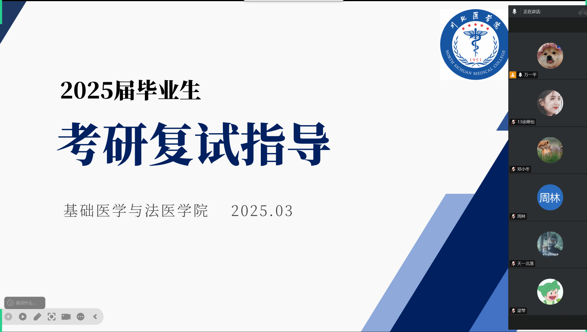 为助力2025届考研学生充分准备复试,提高考研成功率,近日,基础医学与法医学院于通过腾讯会议开展了2025届毕业生考研复试指导交流会。学院党委副书记胡铭峡、法医专业教师、毕业年级辅导员以及考研上国家线同学参加了本次会议。