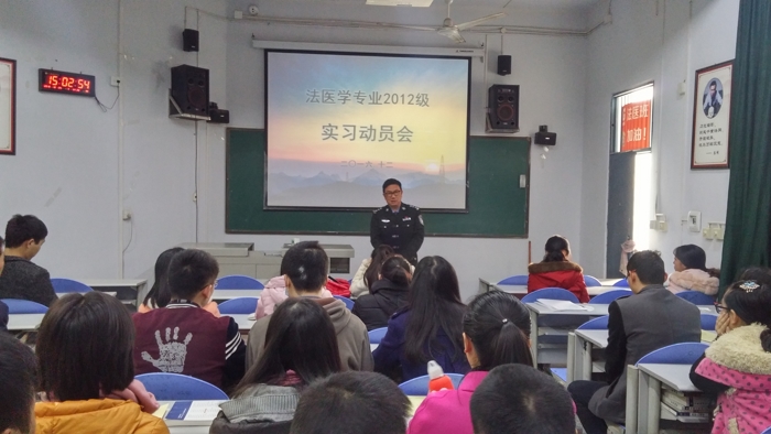 12月26日,法医学专业2012级临案实习动员会在我系专业教室召开,2012级全体同学及系副主任吴松、杜冰、曾恩泉、学生科教师参会。