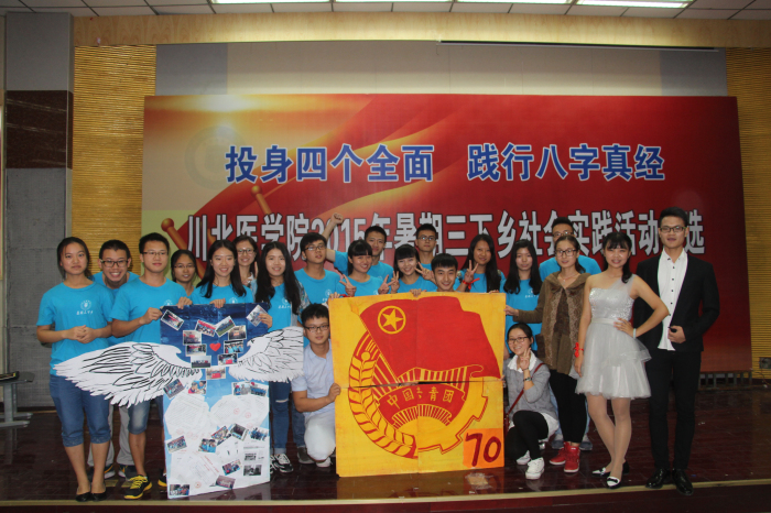9月26号上午,在川北医学院团委主办的2015年 “投身四个全面践行八字真经”的大学生暑期“三下乡”社会实践优秀队伍及个人评选的现场中,代表法医学系的两支社会实践服务团首创佳绩,以优异成绩进入评选的总决赛。其中,法医学系赴重庆北碚社会实践服务团以总成绩第二名的成绩取得“十佳”队伍称号。希望法医学子,发扬团结合作、吃苦耐劳的精神,继续再创佳绩。