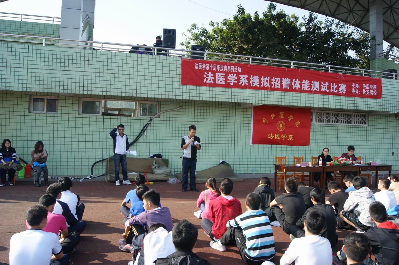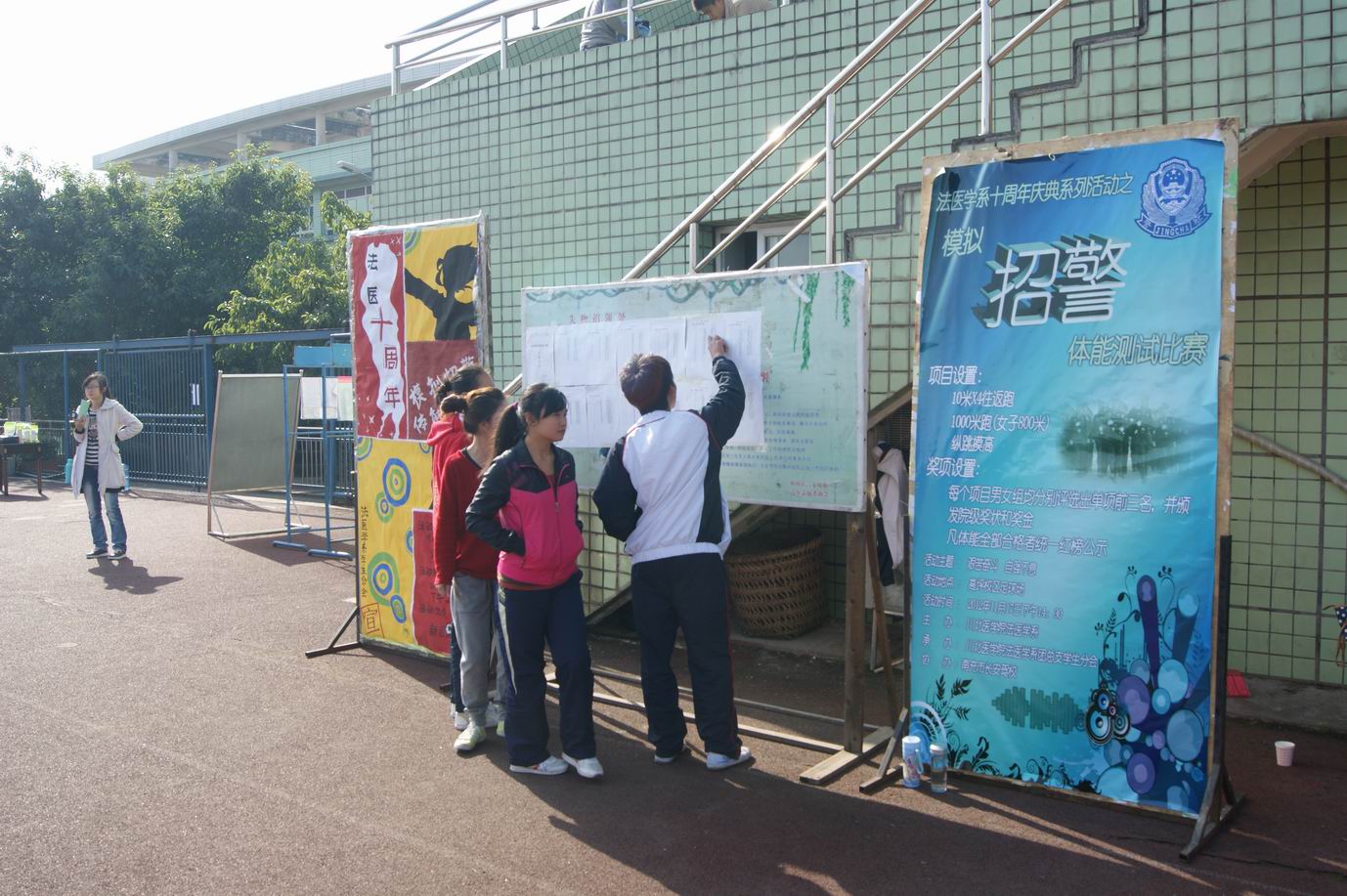 今年是我系建系十周年,以此为主题,我系开展了一系列庆祝活动。为增强同学们强身健体的意识,巩固专业思想,结合我系专业特点,11月17日下午,由团总支学生分会承办的第四届“模拟招警体能测试”比赛在新区足球场举行。与以往不同的是,本次比赛不单有我系的100余名同学参加,还有来自全院的200余名同学的加入。