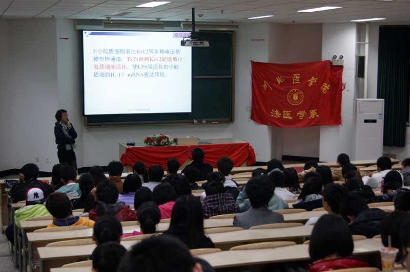 2011年11月6日在川北医学院顺庆校区第一教学楼302教室,我系与学院科技处联合举办“低频重复磁刺激对小胶质细胞的影响”学术讲座,主讲人张丽华老师。参加此次讲座的有全体系部教师及同学。