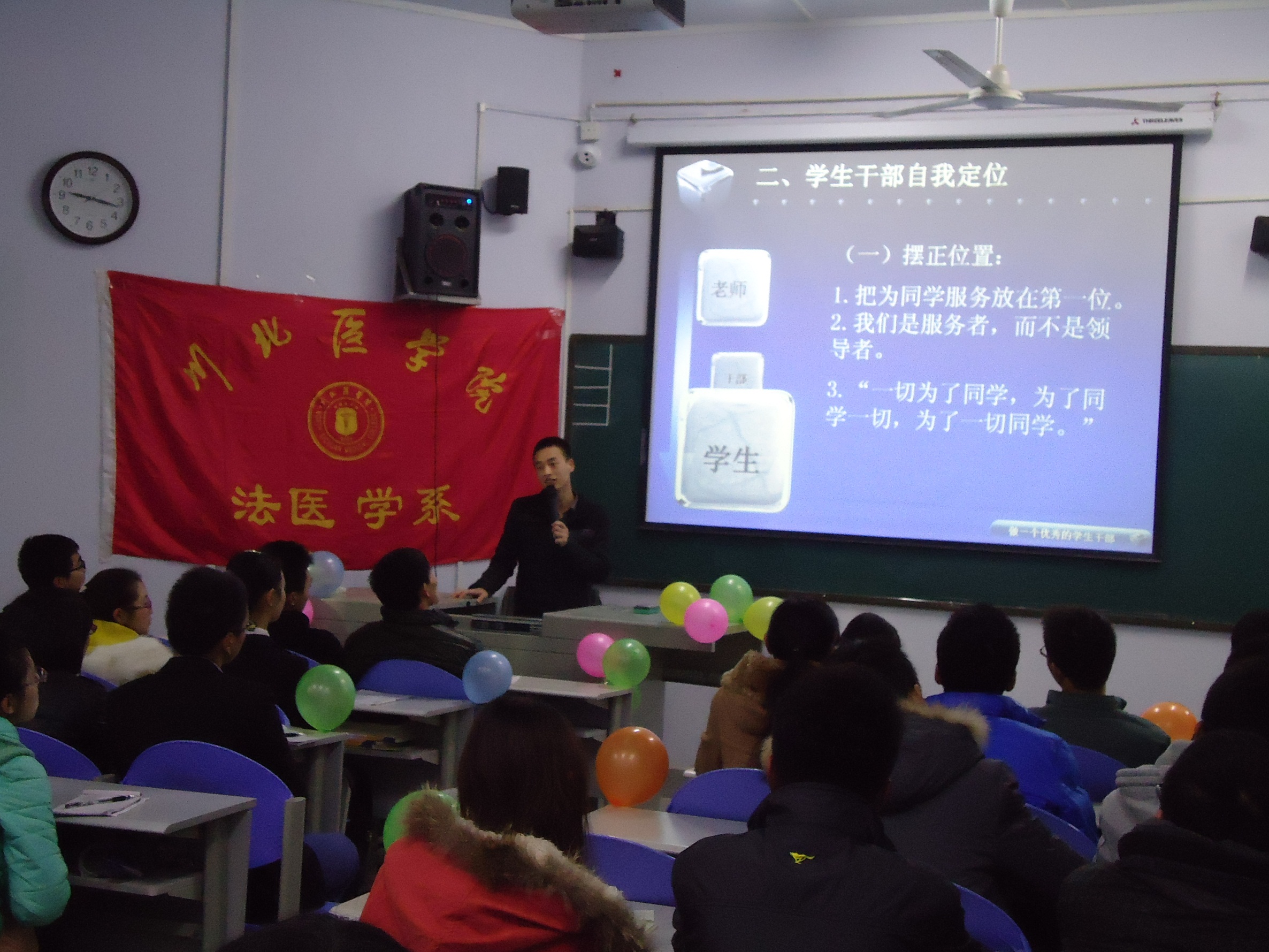 为使全体学生干部在思想意识上进一步明确自身职责,认真为同学们服务,外塑形象,内修素质,进一步加强学生干部队伍建设,提升干事综合素质和工作能力,我系于2013年11月24日上午9时,在法医学系专业教室二教201召开了法医学系干部培训会。培训会上熊翼老师和第五届法医学系学生会主席刘磊师兄做了专题讲座。首先刘磊师兄从五个方面阐述了他在就职期间所得到的心得体会,分别是:学生组织的定位、学生干部应妥善处理的几种关系、学生干部的具体工作、学生干部应提升的几种精神、学生干部应把握的关键;紧接着,熊翼老师就刘磊师兄的发言以及自己的心得体会和对同学们的要求及建议,对本次法医学系干部培训会进行了精彩的总结。