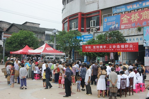 志愿服务活动已进入第五天,有前期调查及宣传工作为基础,群众对服务团的认可度和美誉度都很高,义诊活动还未正式开始,现场已是人群涌动。义诊活动项目包括基本健康状况登记、视觉、嗅觉、血压、脉搏、平衡度检查等,执业医师则向群众提供健康咨询和初步诊断。接受义诊的群众,上至90高龄的老人,下至几岁的孩童,有镇上的居民,也有知道消息专程从乡下赶来的农民朋友。“是,他们是免费帮我们体检的”,“年轻人啊,感谢你们了”,“我娃娃也在川北医学院上学呢,就是他们学校”……活动现场,人声鼎沸,总能听到这些振奋队员精神的话语,队员们鼓足干劲,将学到的知识发挥尽致,一刻不停的进行着检查和耐心的讲解:引导员穿梭于人群中维持秩序,不时搀扶行动不便的老人;体检表登记队员大声的向群众提问、解释,好几名队员声音嘶哑;在嘈杂的人声中测量血压需要高度集中精力,本着对群众负责任的态度,队员们不敢有丝毫放松,这几名队员累了,又换另一批,先后换了三次,最大限度的保证为群众准确测量……队员们用自己的表现让群众深切感受到他们无私奉献和真诚服务的心,义诊现场始终秩序井然,有条不紊,群众积极配合队员们的协调,耐心等待接受检查,周围的商贩店员们,时不时的拿来矿泉水,租赁桌椅的大叔问了一句“你们就是来搞免费义诊的啊?”当得到肯定回答的时候,他大方的表示,自己也要出一份力,无偿提供桌椅使用……这一切,让队员们感动不已,淳朴的老百姓,你对他们好一点,他们就会百倍的回报,他们都是最可爱的人!