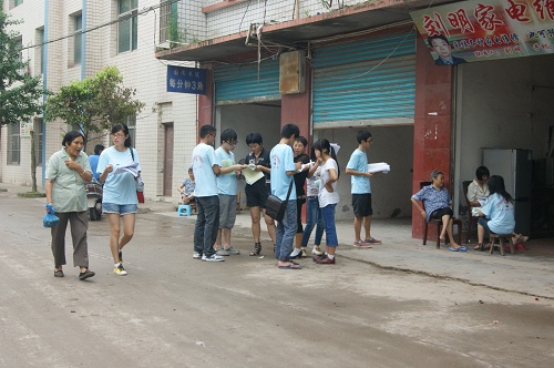 5日至6日,问卷调查和宣传集中在花桥镇开展。花桥镇地处交通要道,经济较发达,人口稠密,比普通的镇子大上不少,团队采取分组走访的形式开展工作。调查采取随机抽样的方式,不论性别、年龄、职业,队员们或走访行人,或上门宣传,充分发挥着主观能动性,接受调查的镇民从最初微有防范或抵触,到逐渐认同进而主动配合,与队员耐心细致的讲解和坚持不懈的努力密不可分:热心肠的大爷叫来身边的朋友、亲戚,一起填写问卷;过往的三轮车师傅特地停下车来主动索要问卷和宣传资料;活泼的小朋友拿着问卷和宣传资料问着各种问题,让队员们也过了一把教师瘾。