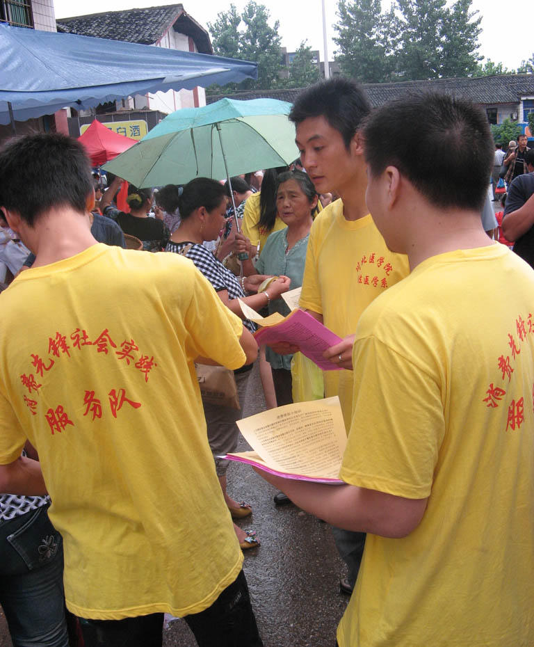 7月18日,川北医学院法医学系赴南充城、乡消费者维权服务队来到顺庆区潆溪镇与当地工商所携手大力向当地群众讲解消费者维权方面的知识,并向他们发放消费者维权方面的知识单。进几天来,南充各地遭受了罕见的暴雨袭击,但是大雨并没有影响到当地群众的热情,也没有阻挡住队员们下乡宣传知识服务消费者的决心。