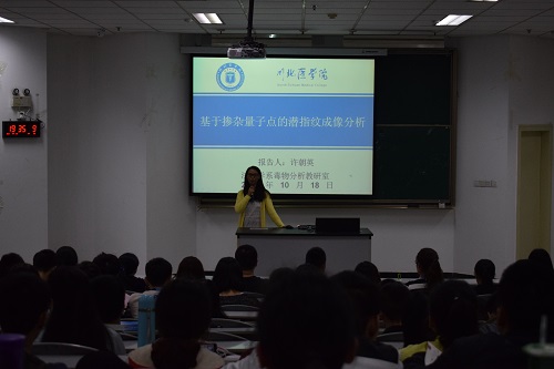 许朝英老师讲座中指出目前铝制品上的潜指纹难以成像,通过掺杂量子点的方法可以有效地成像潜指纹,并且这一方法具有普适性,可以成像多种物品上的潜指纹。许老师深入浅出的讲解,让同学们学到了新知识,对潜指纹成像有了新认识,有效激发了同学们的学习兴趣。