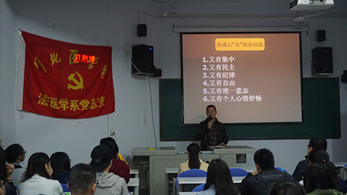 为深入学习党章,贯彻落实十八届六中全会精神,2016年11月2日下午,法医学系学生党支部在顺庆校区201教室召开了党支部大会,法医学系党总支副书记曾恩泉,学生党支部书记金波和法医学系全体党员及预备党员参加了本次大会。