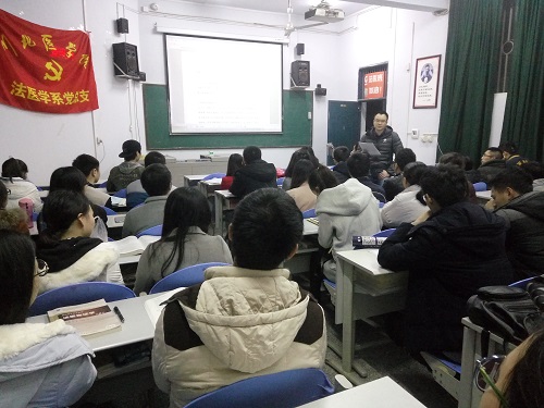 12月15日晚,法医学系学生党支部在顺庆校区第二教学楼405召开了以“学习习近平总书记在高校思想政治工作会议上的讲话”为主题的党支部大会,法医学系学生党支部书记金波、辅导员田馨雅以及法医学系全体党员、预备党员参加了此次大会。