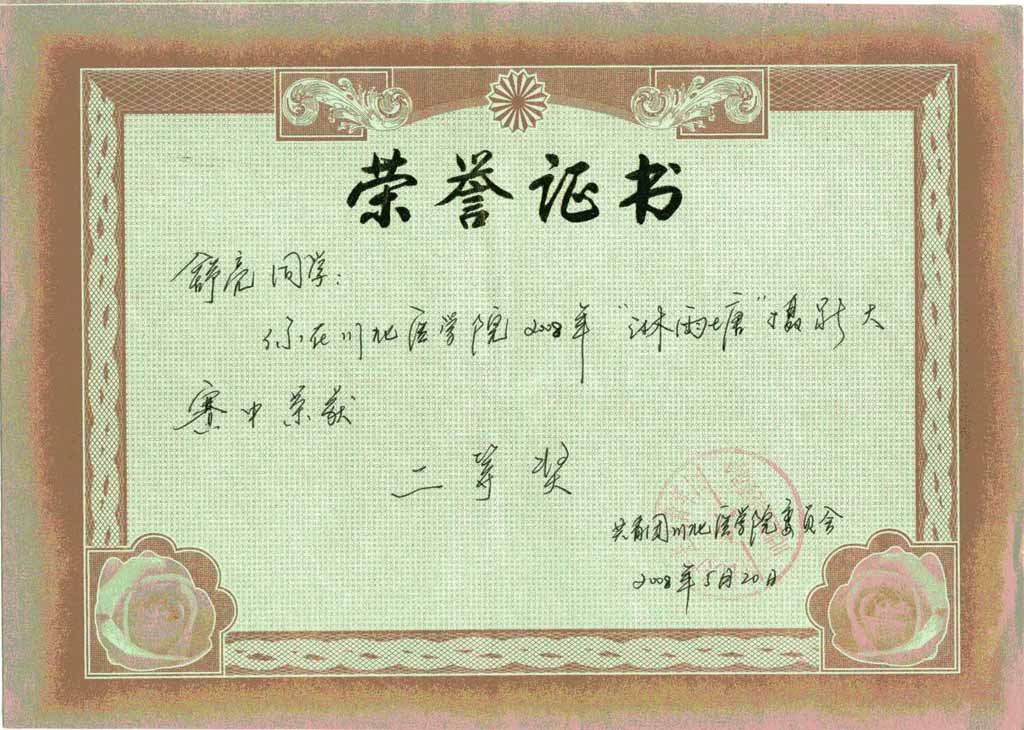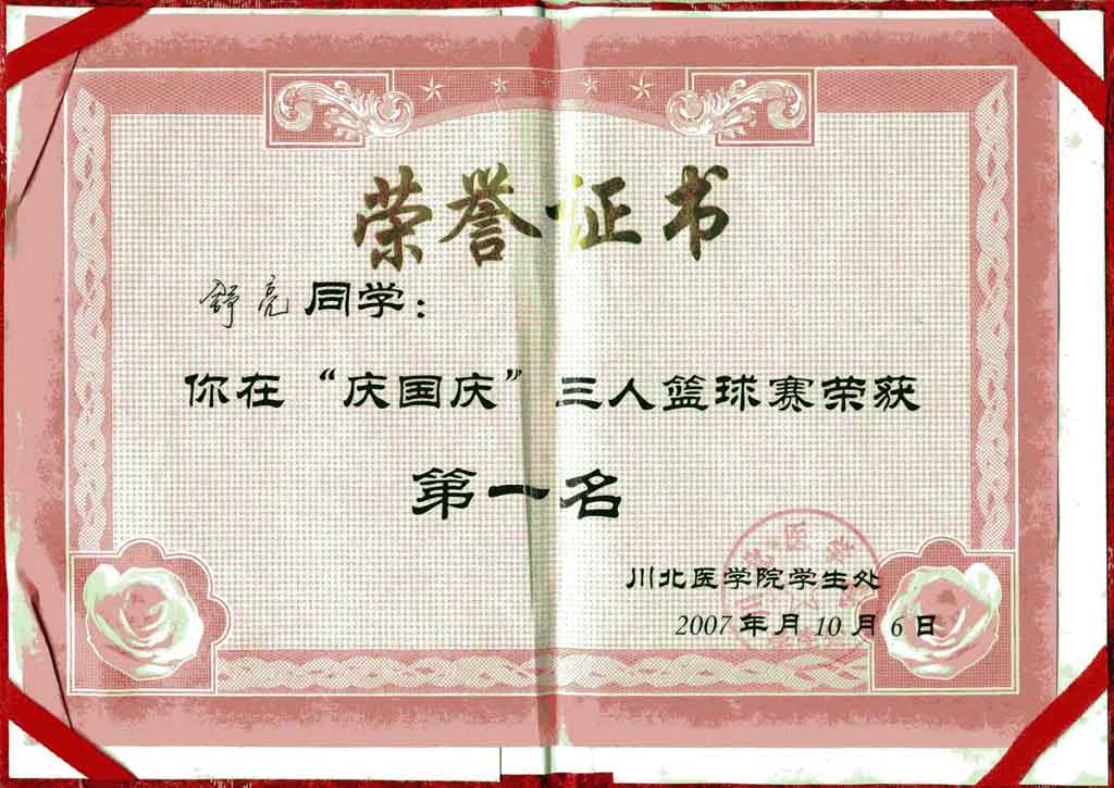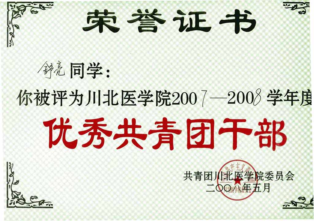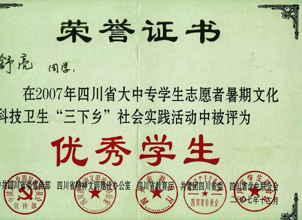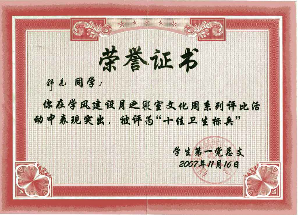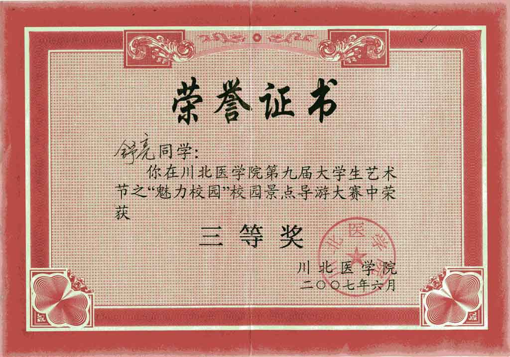 此外他曾获以下荣誉:四川省大学生A级素质证书、百名优秀学生党员、优秀学生干部、优秀共青团干部、卫生标兵、院心理剧本征集大赛一等奖、“庆国庆”三人篮球赛一等奖、“淋雨塘”摄影大赛二等奖、“和谐校园”十大经典语录征集大赛二等奖、秋季足球联赛二等奖、院“魅力校园”校园景点导游大赛三等奖。