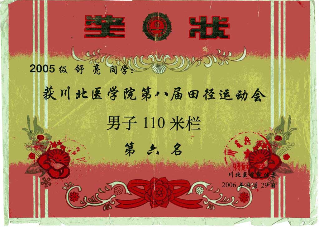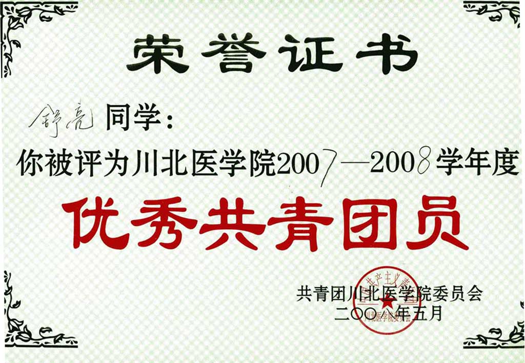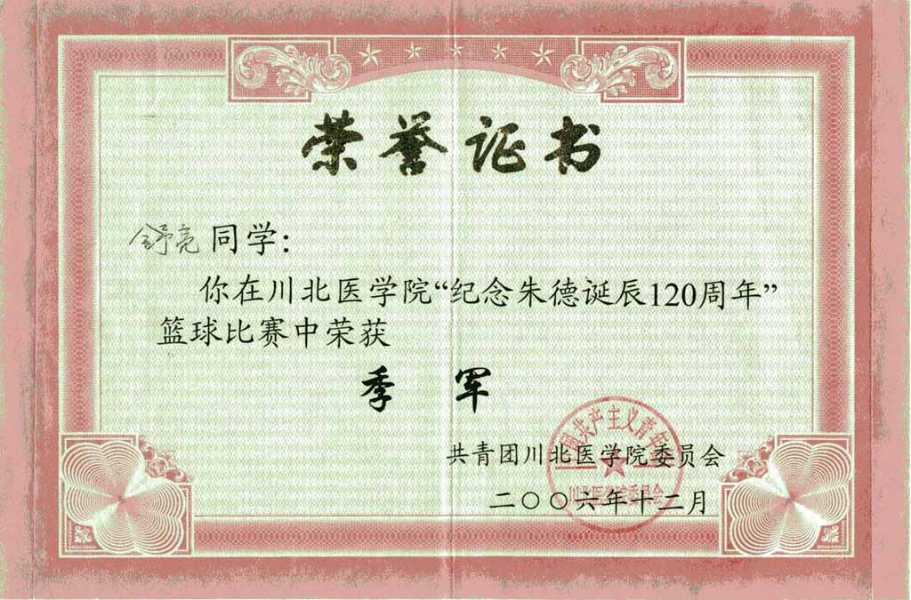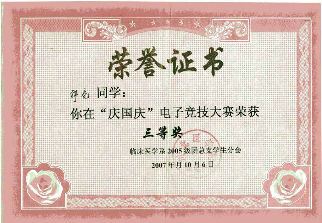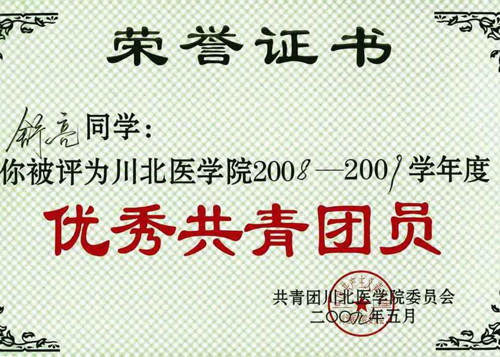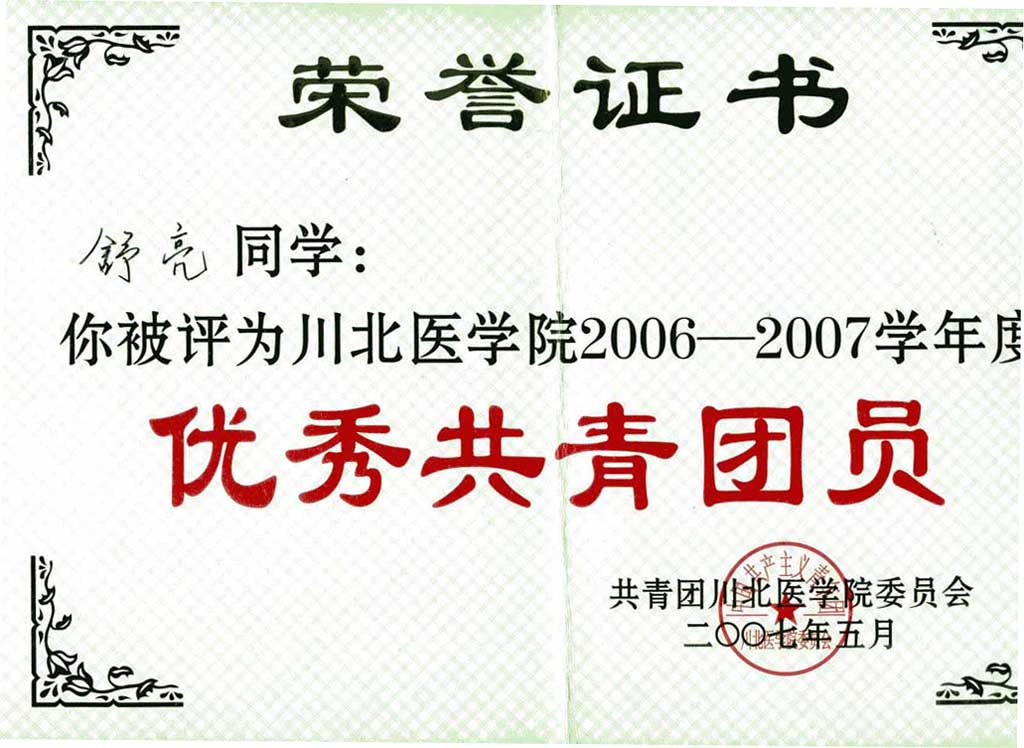 此外他曾获以下荣誉:四川省大学生A级素质证书、百名优秀学生党员、优秀学生干部、优秀共青团干部、卫生标兵、院心理剧本征集大赛一等奖、“庆国庆”三人篮球赛一等奖、“淋雨塘”摄影大赛二等奖、“和谐校园”十大经典语录征集大赛二等奖、秋季足球联赛二等奖、院“魅力校园”校园景点导游大赛三等奖。