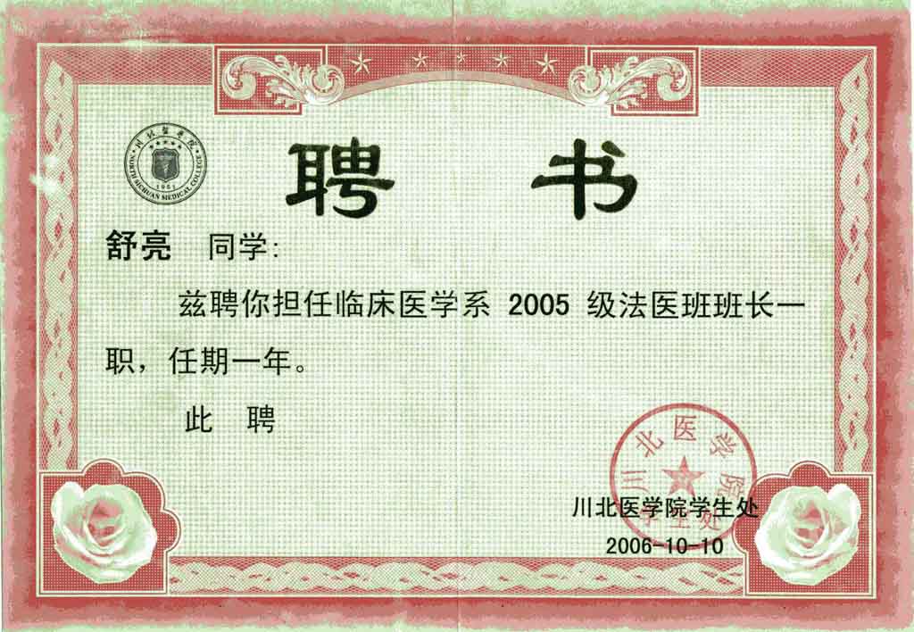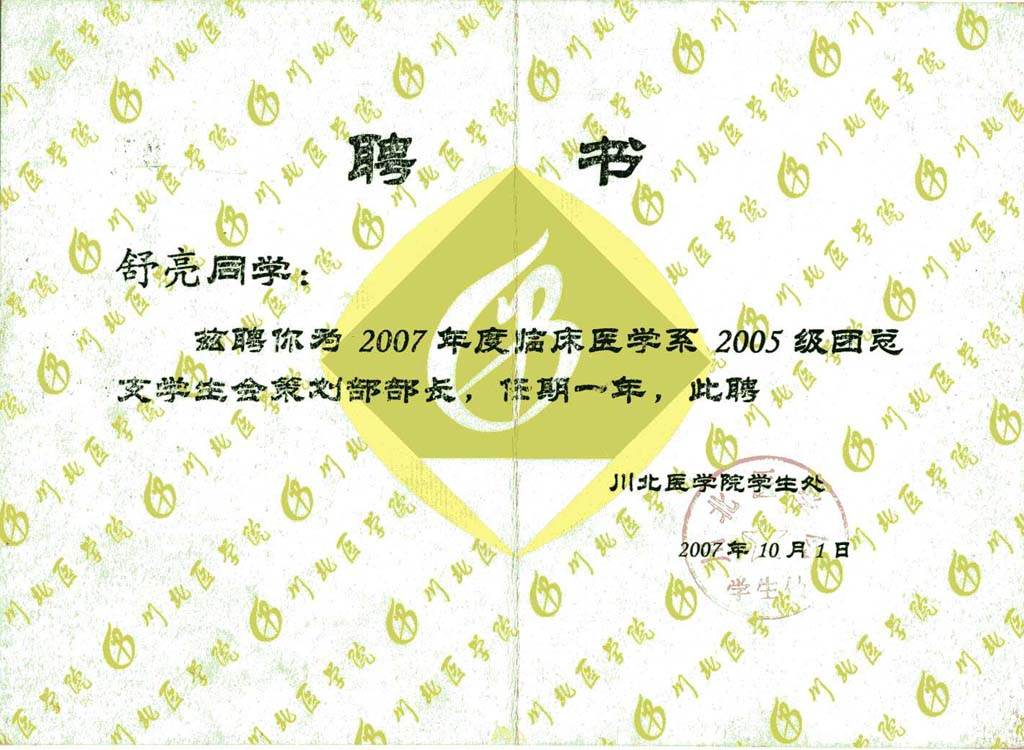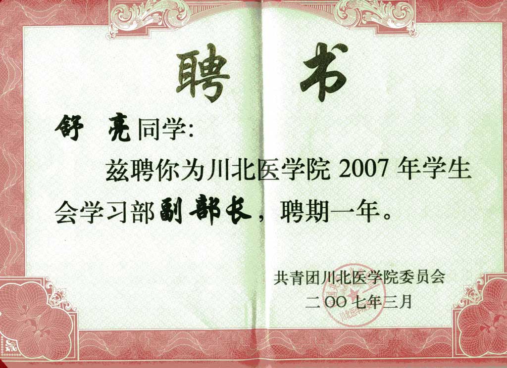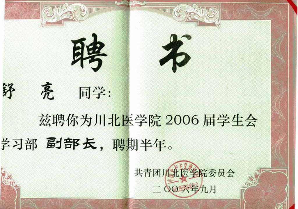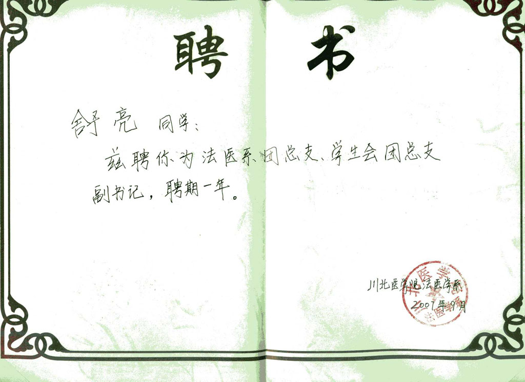 工作:曾任法医系团总支副书记、院学生会学习部副部长、临床医学系策划部部长、班级班长。组织策划法医系迎新晚会、院第二届广播体操大赛、临床医学系首届秋季运动会、临床医学系足球篮球联赛等大型活动。