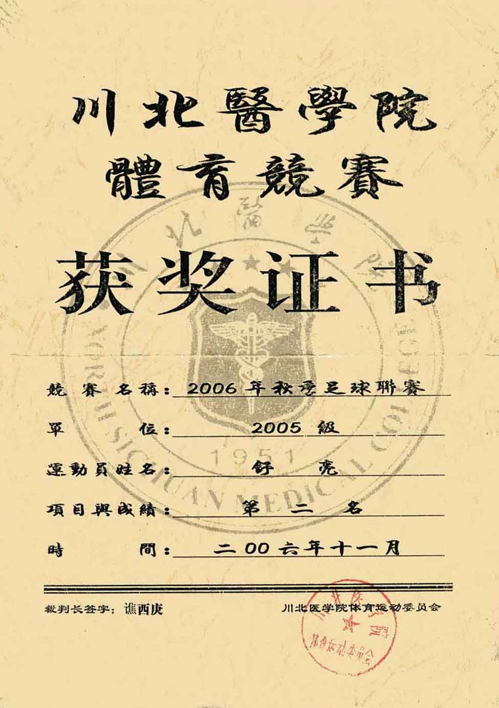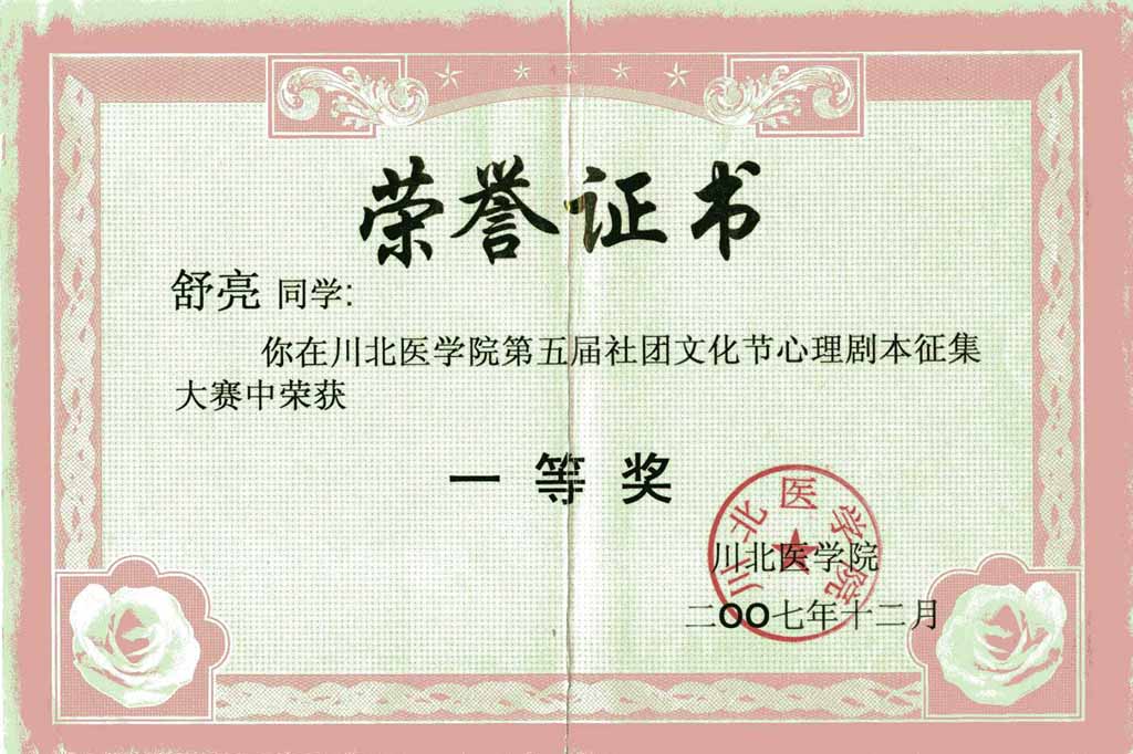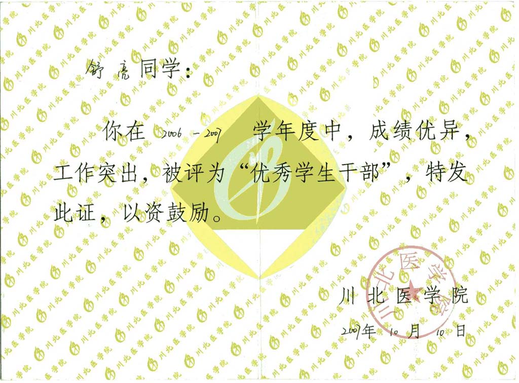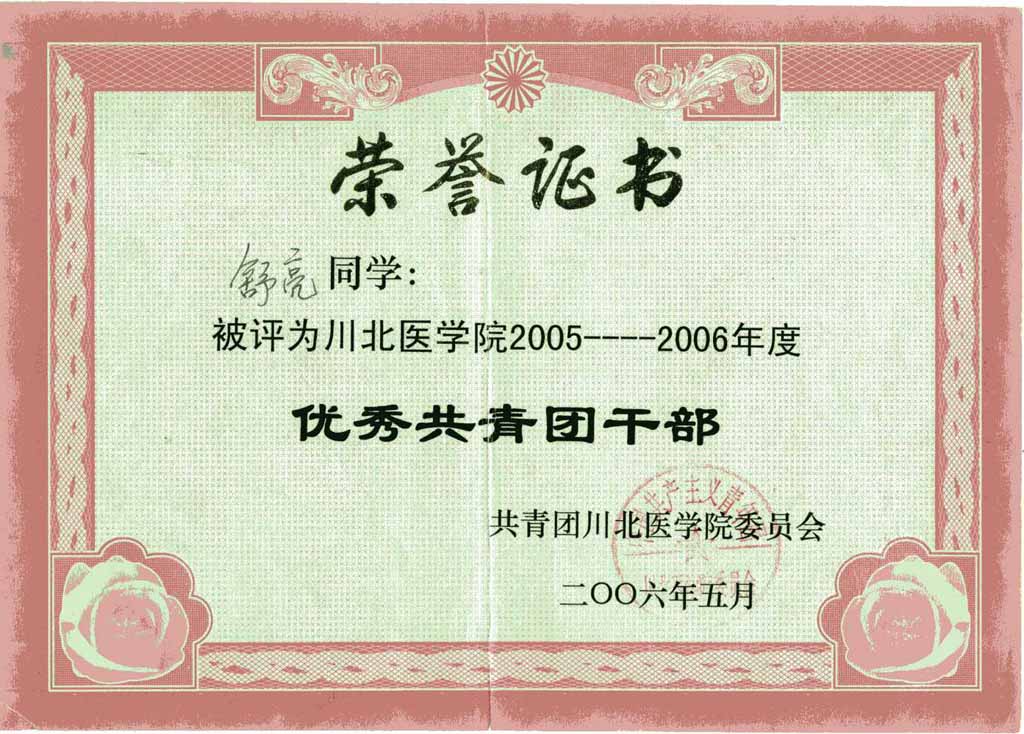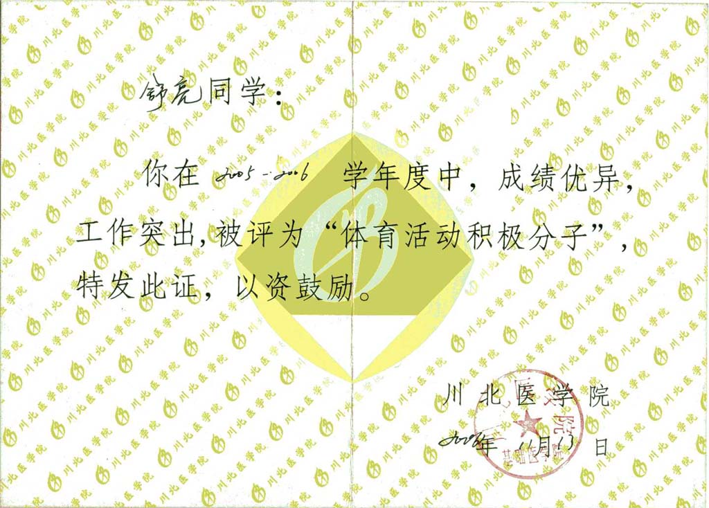 工作:曾任法医系团总支副书记、院学生会学习部副部长、临床医学系策划部部长、班级班长。组织策划法医系迎新晚会、院第二届广播体操大赛、临床医学系首届秋季运动会、临床医学系足球篮球联赛等大型活动。